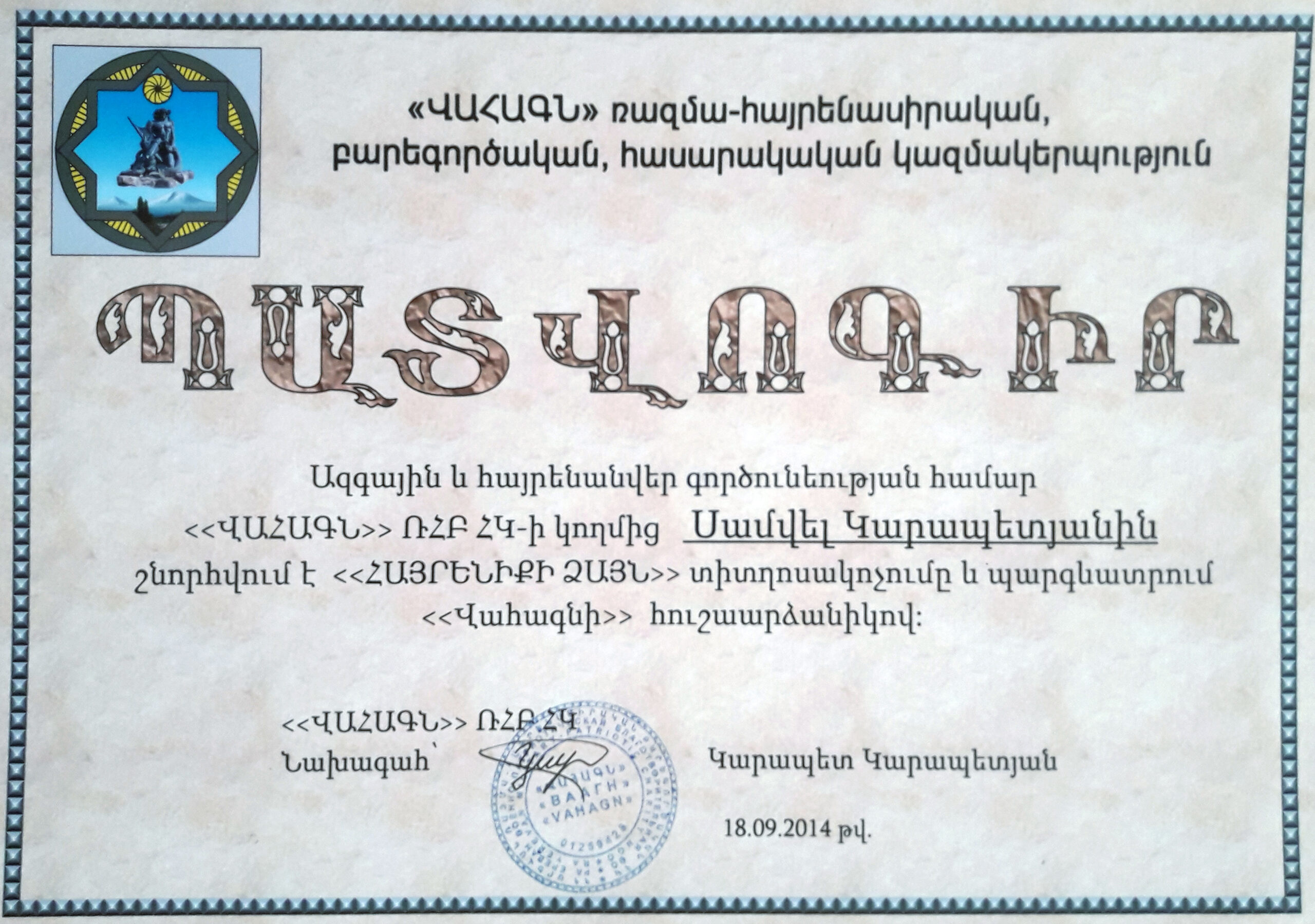 Համառոտ տեղեկություն 2014 թ. սեպտեմբերի 18-ին ՀՃՈՒ հիմնադրամի նախագահ Սամվել Կարապետյանն արժանացել է «Վահագն» ռազմահայրենասիրական, բարեգործական, հասարակական կազմակերպության պատվոգրի՝ Ազգային և հայրենանվեր գործունեության համար, շնորհվել է «Հայրենիքի ձայն» տիտղոսակոչում, ինչպես նաև պարգևատրվել է «Վահագնի» հուշարձանիկով: